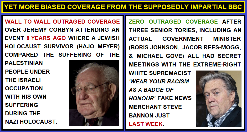 If you want to get an idea of the astounding levels of bias in BBC broadcasting, just consider the disparity in coverage between their wall to wall negative coverage of Jeremy Corbyn attending a Holocaust event eight years ago in which the Jewish Holocaust survivor Hajo Meyer presented a talk called "the misuse of the Holocaust for political purposes", and the absolute silence they've maintained on the fact that three senior Tories, including a government minister (Boris Johnson, Jacob Rees-Mogg, Michael Gove), had meetings with the extreme-right white-supremacist fake news merchant Steve Bannon just last week.